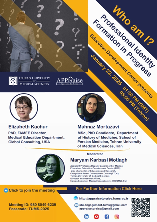 موضوع این وبینار ‘’Who am I? Professional Identity Formation in Progress’’ است و سخنرانان Pro.Elizabeth Kachur، مدیر FAMEE و مهناز سادات مرتضوی، دانشجوی دکترای تاریخ پزشکی دانشگاه علوم پزشکی تهران هستند؛ همچنین تسهیلگر برنامه دکتر مریم کرباسی مطلق، استادیار آموزش پزشکی دانشگاه علوم پزشکی تهران است.