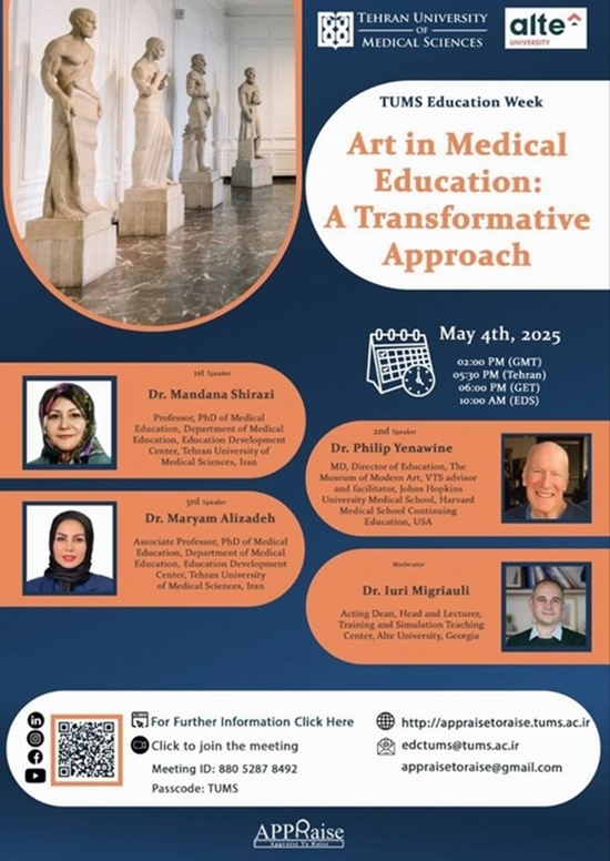 به گزارش روابط عمومی مرکز مطالعات و توسعه آموزش دانشگاه علوم پزشکی تهران;  جزئیات وبینار بین المللی (به زبان انگلیسی) Art in Medical Education: A Transformative Approach  به شرح زیر است: