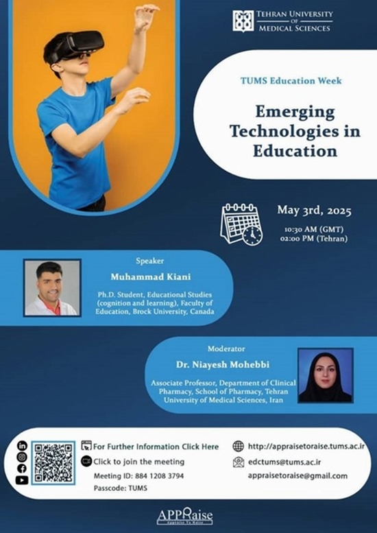 به گزارش روابط عمومی مرکز مطالعات و توسعه آموزش دانشگاه علوم پزشکی تهران;  جزئیات وبینار بین المللی (به زبان انگلیسی) Emerging Technologies in Education به شرح زیر است:
