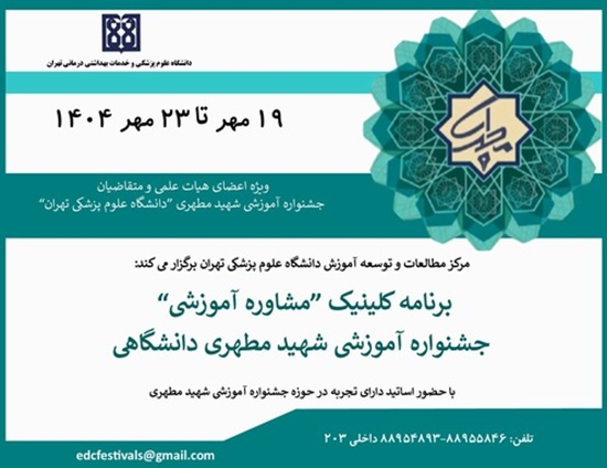 به گزارش روابط عمومی مرکز مطالعات و توسعه آموزش دانشگاه علوم پزشکی تهران، با توجه به اعلام فراخوان برگزاری "نوزدهمین جشنواره آموزشی شهید مطهری" به منظور ارائه خدمات هرچه مطلوب تر به اعضای هیات علمی و متقاضیان ارسال فرایندها به جشنواره، مرکز مطالعات و توسعه آموزش دانشگاه در نظر دارد "برنامه کلینیک آموزشی مشاوره فرد به فرد" را با حضور اساتید با تجربه در حوزه جشنواره برگزار کند.