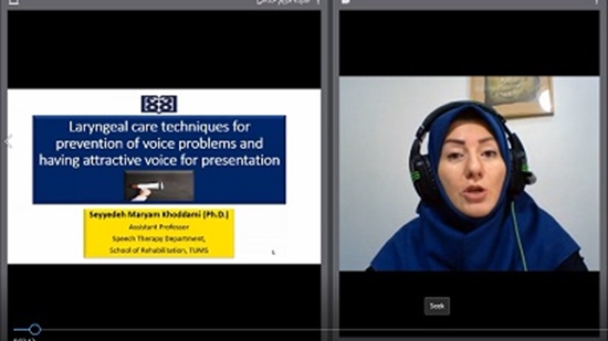 موضوع این نشست، تکنیک های تقویت تارهای صوتی برای بهبود فن بیان در یک سخنرانی بود. دکتر سیده مریم خدامی، عضو هیات علمی دانشگاه علوم پزشکی تهران در این نشست مجازی، به تدریس اهمیت داشتن صدای گوش نواز به منظور ارائه یک سخنرانی موفق، چگونگی کسب یک صدای جذاب، تکنیک های صداسازی، ویژگی های صدای سالم و پاتولوژیک پرداخت. همچنین به سوالات دانشجویان در خصوص مبحث تدریس شده پاسخ داد. وی در پایان تکنیک هایی را برای مراقبت از حنجره به منظور پیشگیری از مشکلات صدا بیان کرد و تمرین هایی را به منظور آماده کردن حنجره قبل از سخنرانی آموزش داد.