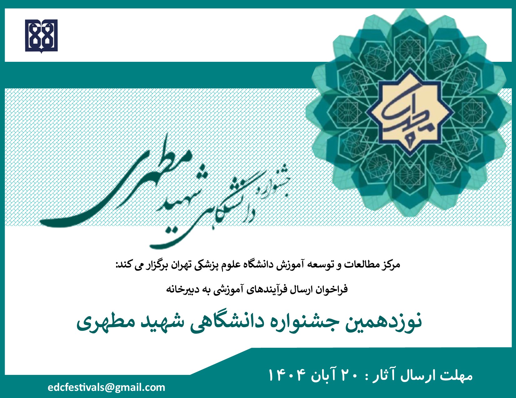 جشنواره آموزشی شهید مطهری به منظور تجلیل و تکریم اساتید عرصه آموزش پزشکی و برای شناسایی و معرفی فرآیندهای آموزشی مطلوب کشوری، دانشگاهی و همچنین نوآوری، ابداع و معرفی فرآیندهای جدید در حیطه های روش ها و تکنیک های آموزشی، سنجش، ارزشیابی و اثربخشی آموزشی، مرجعیت، رهبری و مدیریت آموزشی، مشاوره و راهنمایی، فعالیت های فرهنگی و امور تربیتی و اجتماعی، قوانین، مقررات و ساختارهای آموزشی، محصولات آموزشی به منظور ارتقاء آموزش پزشکی برگزار می گردد.
